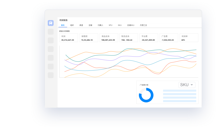 組織視角、平臺視角、店鋪視角、歸屬人視角、SKU視角綜合分析利潤概況與成本結(jié)構(gòu)等維度數(shù)據(jù)
